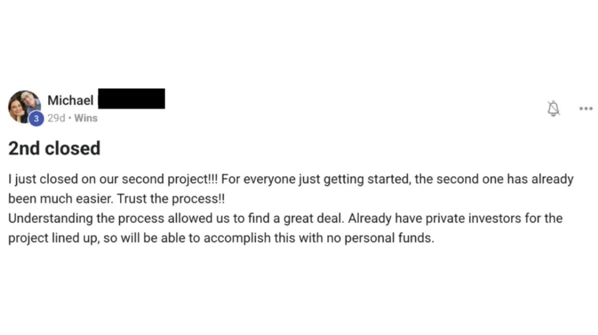 Many of our members see results within the first 30-60 days. While we can't guarantee success, we have created a 21-day fast track to get you daily, actionable steps to start making offers and flipping houses.